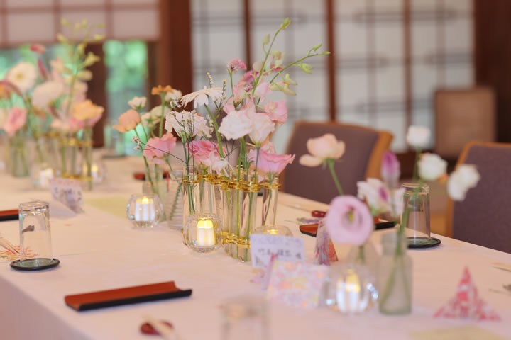 一面に庭園を望む、風情ある20帖の中広間。 派手な演出よりも、ご家族と過ごす特別な時間を大切にしたいおふたりへ。 宴内結婚式やフォトウェディングに必要なアイテムが揃う「手ぶらでウェディングパッケージ」をご用意。 特別な一日を、心を込めてお手伝いいたします。 |